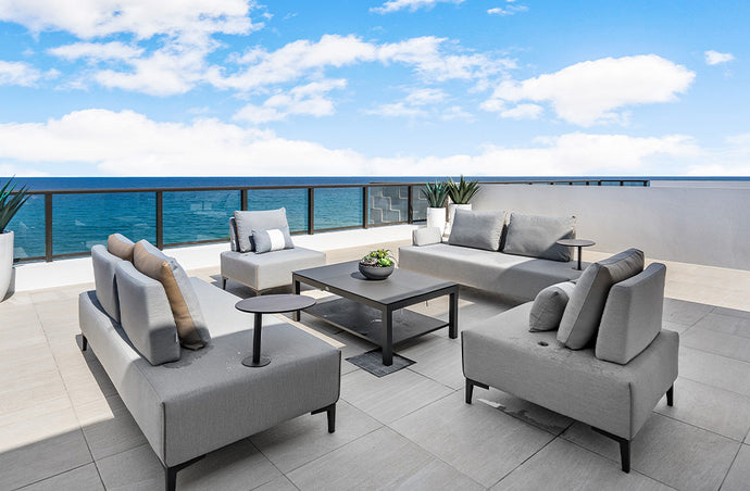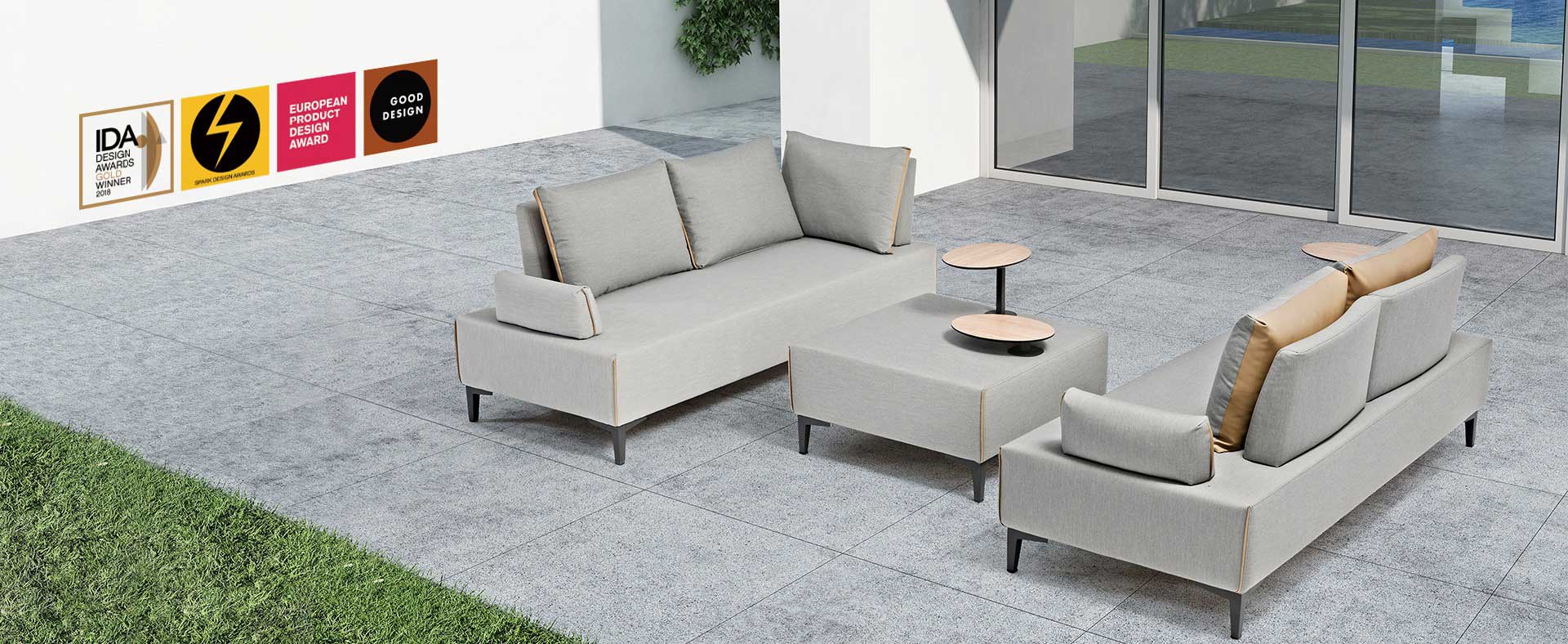 Disponible en aluminium anthracite avec tissu COUTUREtex imperméable et résistant aux UV, FLEXI allie durabilité, esthétisme et fonctionnalité. Sa mousse haute densité assure un confort optimal, tandis que les plateaux en HPL haut de gamme permettent une utilisation pratique au quotidien.